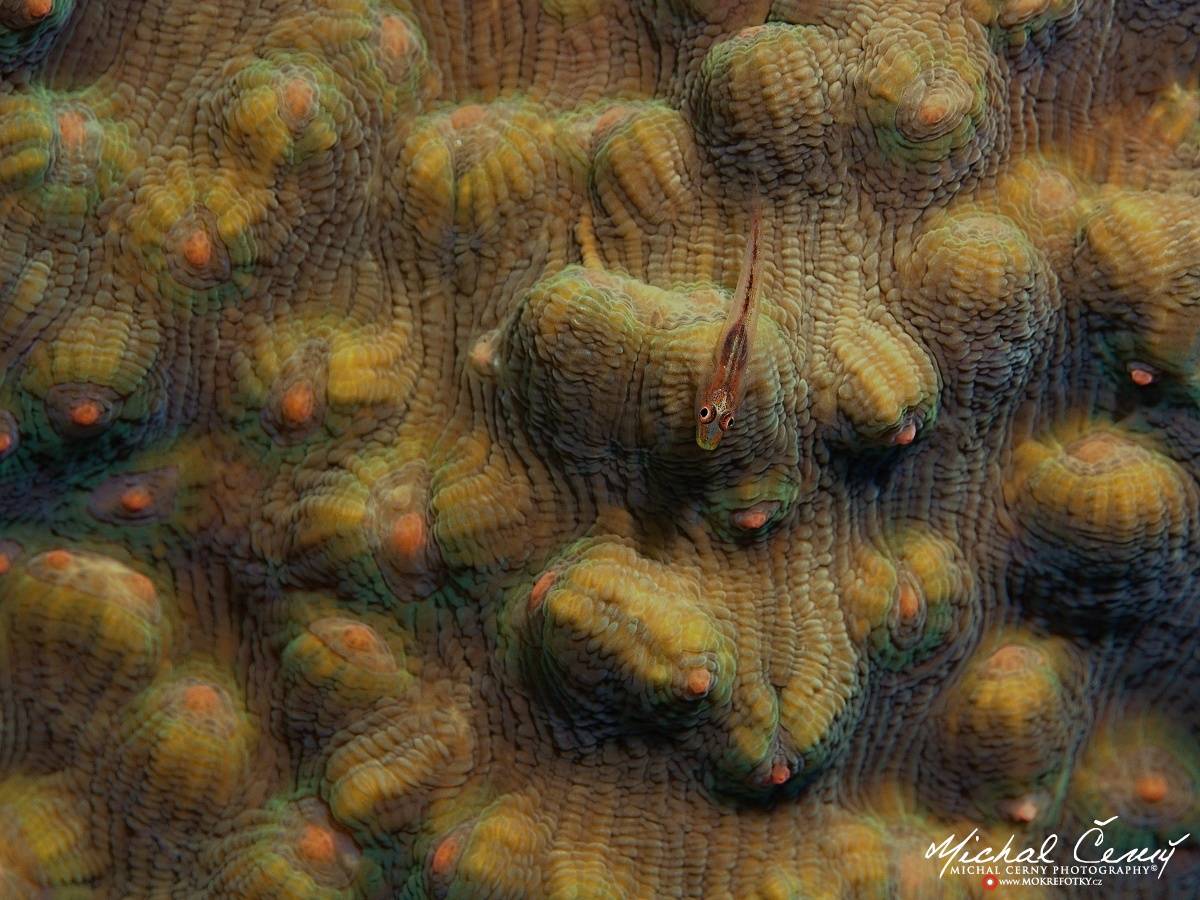 Tento druh hlaváče je velký jen několik centimetrů a často ho můžeme najít na tvrdých korálech, tak jako je tomu na této fotografii.