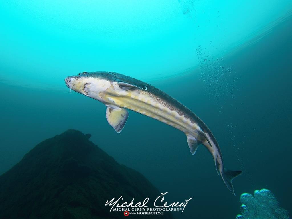 Lomy v německém Löbejünu obývá hned několik druhů jeseterů. Na tomto snímku je zachycen jeseter ruský, kterého lze od jesetera sibiřského poznat podle kratšího čumáku.