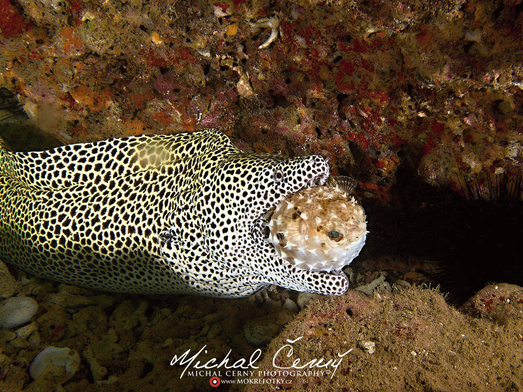 Tak tohle jsem viděl poprvé v životě. Muréna na lovu bědem dne a v tlamě má nafouknutého ježíka, nějakou dobu s ním bojovala, ale nakonec ho sežrala. Ještě v jejím břiše byl pak vidět obrys nafouknutého ježíka.
