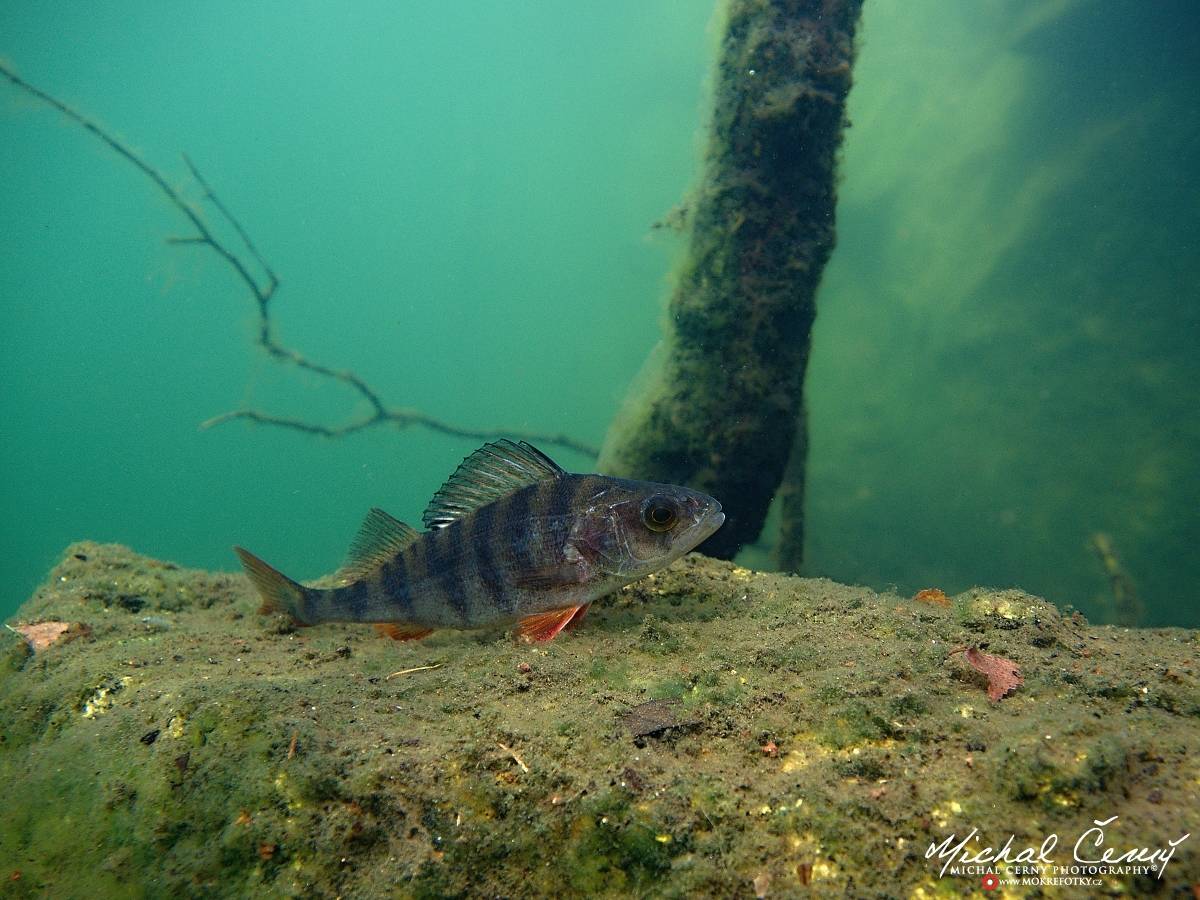 Také okouni občas odpočívají tak, že si lehnou na dno. Tento konkrétní tam seděl jak přibitý, dokonce i po hodině jsem ho našel na stejném místě.