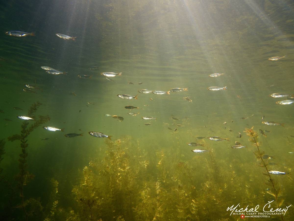 Hejno bělic zalité paprsky poledního slunce se prohání nad porostem vodních rostlin.