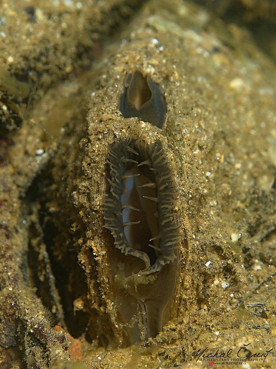 Škeble rybničná je naším největším měkkýšem, živí se filtorváním vody. Na fotografii je detail ústního otvoru s hmatovými výrůstky.
