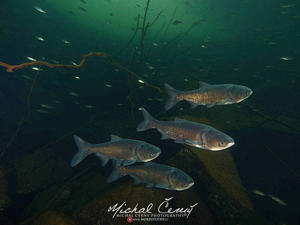 Tolstolobici jsou většinou velmi plaché ryby a fotit je pod vodou je velmi ložité. V zimě pod ledem jsou však trošku pomalejší a tak se mi k nim konečně podařilo pořádně přiblížit.