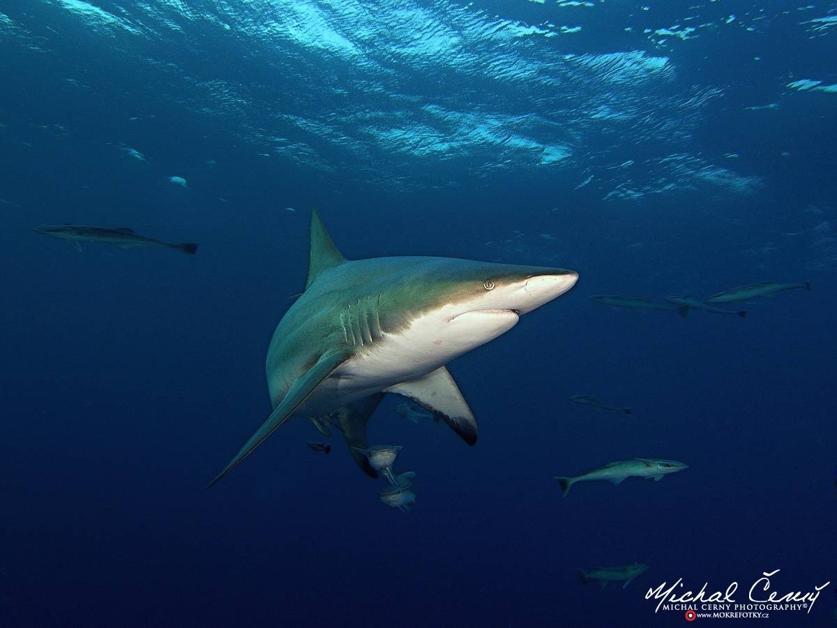 Žraloky černocípé doprovázejí na volném moři početná hejna štítovců, kteří si často "přesedají" z jednoho kusu na druhý.