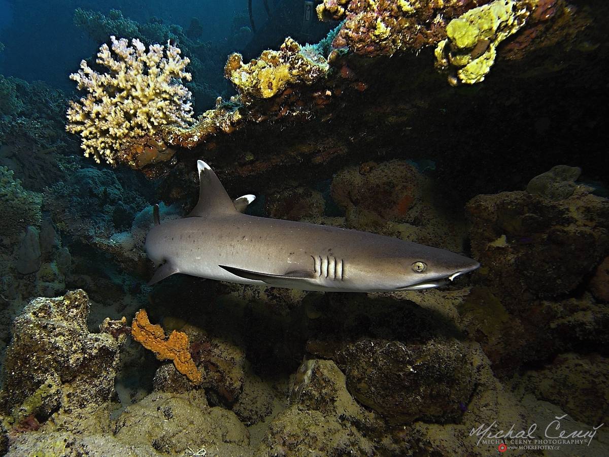 Mládě žraloka lagunového, neboli lidově bělocípáka, si našlo bezpečný úkryt pod velkým korálem.